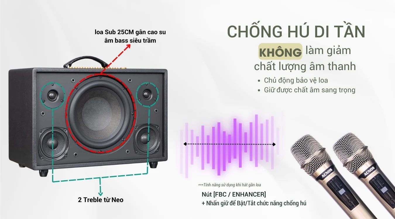 Loa karaoke di động ACNOS CS3600PRO có chức năng Chống Hú Di Tần - Một tính năng phương pháp chống hú bằng cách dịch chuyển tần số. Ưu điểm của phương pháp này là Mic vẫn nhẹ hơi dễ hát như bình thường. Đây là tính năng đã được tích hợp và lập trình tự động có sẵn trong máy. Ngoài ra, hiệu ứng Reverb đa kênh độc quyền của ACNOS giúp tiếng hát mượt mà. Song song đó, tính năng Enhancer giúp nghe nhạc to hơn. Đáng lưu ý, tính năng chống hú FBC chủ động bảo vệ loa, giữ được chất âm sang trọng chỉ cần Nhấn giữ để Bật/Tắtchức năng chống hú hoặc Nhấp 2-lần để Bật/Tắt chức năng nâng tiếng nhạc (music ENHANCER)