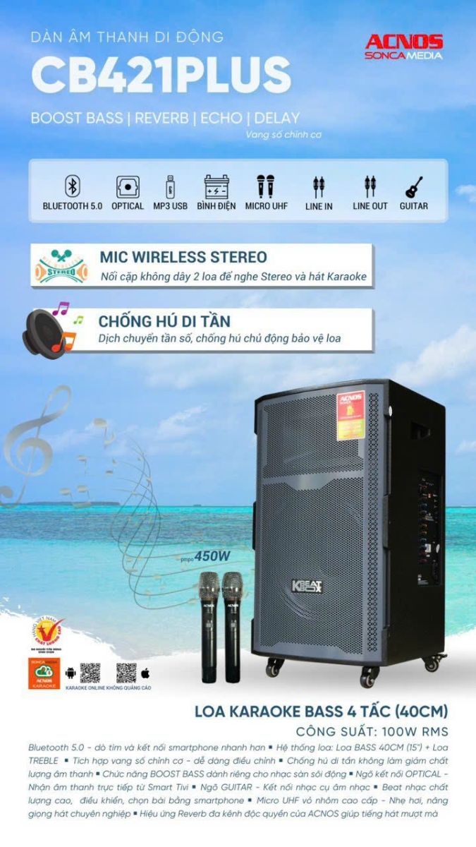 ACNOS CB421PLUS được thiết kế Thùng gỗ sơn gai màu đen, mặt lưới đen gắn kèm bánh xe dễ dàng di chuyển. Hệ thống loa bao gồm 1 loa Bass 4 tấc (40cm) và 1 loa Treble cho âm thanh mạnh mẽ, trầm ấm. Công suất RMS 100W tương đương công suất PMPO lên đến 450W. Micro UHF cao cấp không dây nhẹ hơi, nâng giọng hát karaoke chuyên nghiệp.