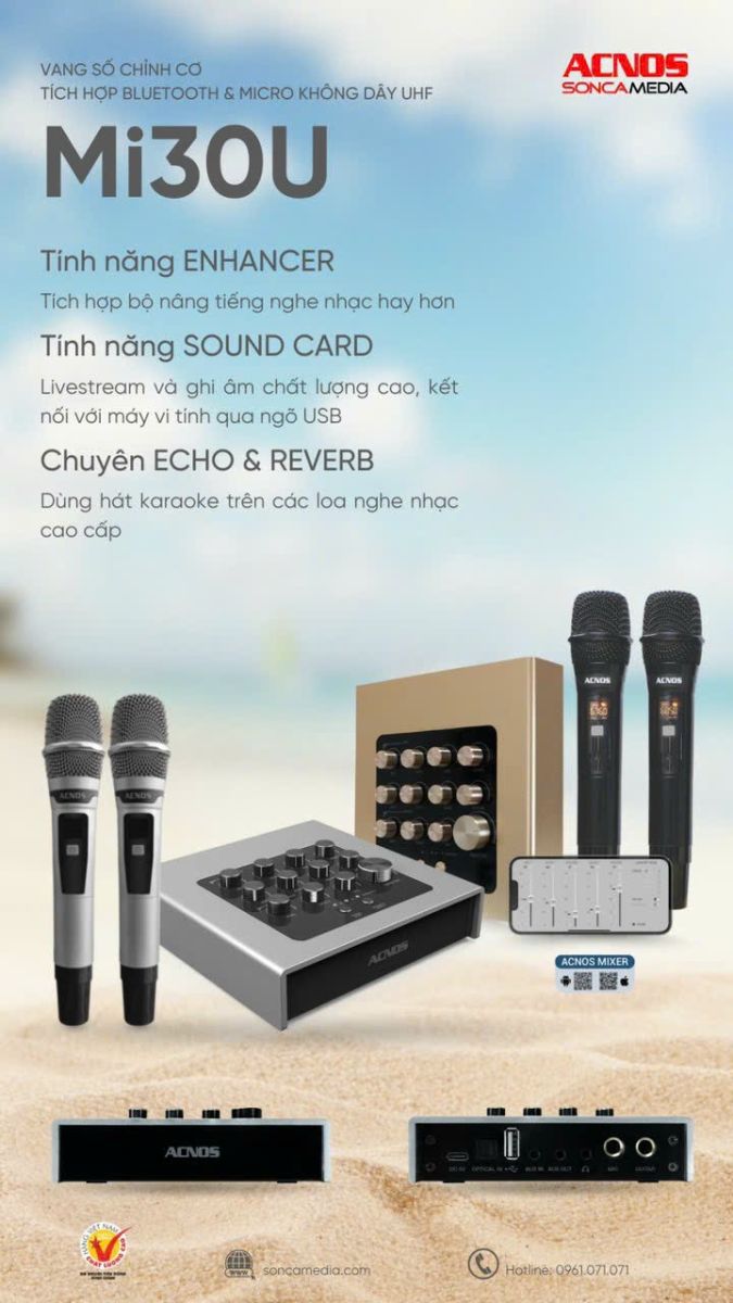 Mixer ACNOS Mi30E được xem là một vang số siêu nhỏ khi kích thước sấp xỉ một con chuột máy tính không dây, một mặt bởi tất cả các nút điều khiển cơ bản đều được thiết kế nằm trên micro UHF đi kèm, một mặt khác, tất cả tính năng của mixer được điều chỉnh trên App di động.