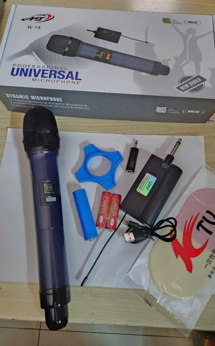 - Bộ Micro Karaoke Không Dây Universal W14 Chất Lượng bao gồm 1 Micro cầm tay không dây và 1 đầu thu sử dụng tần số riêng biệt.